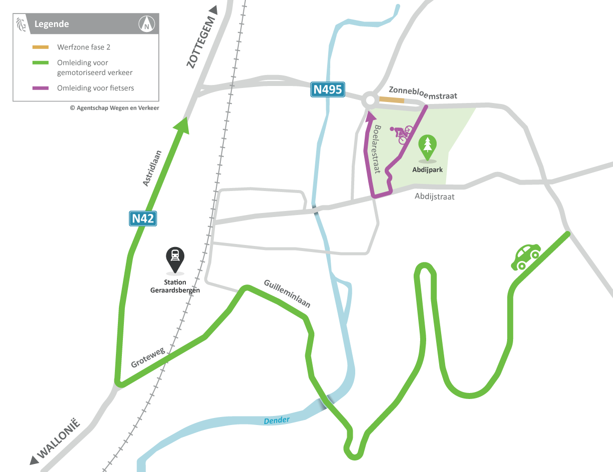 De Volderstraat wordt volledig afgesloten in beide richtingen. Gemotoriseerdverkeer volgt in beide richtingen een omleiding via de Zonnebloemstraat (N495), Astridlaan (N42), Aalstsesteenweg (N460), Moenebroekstraat en Kampstraat.
