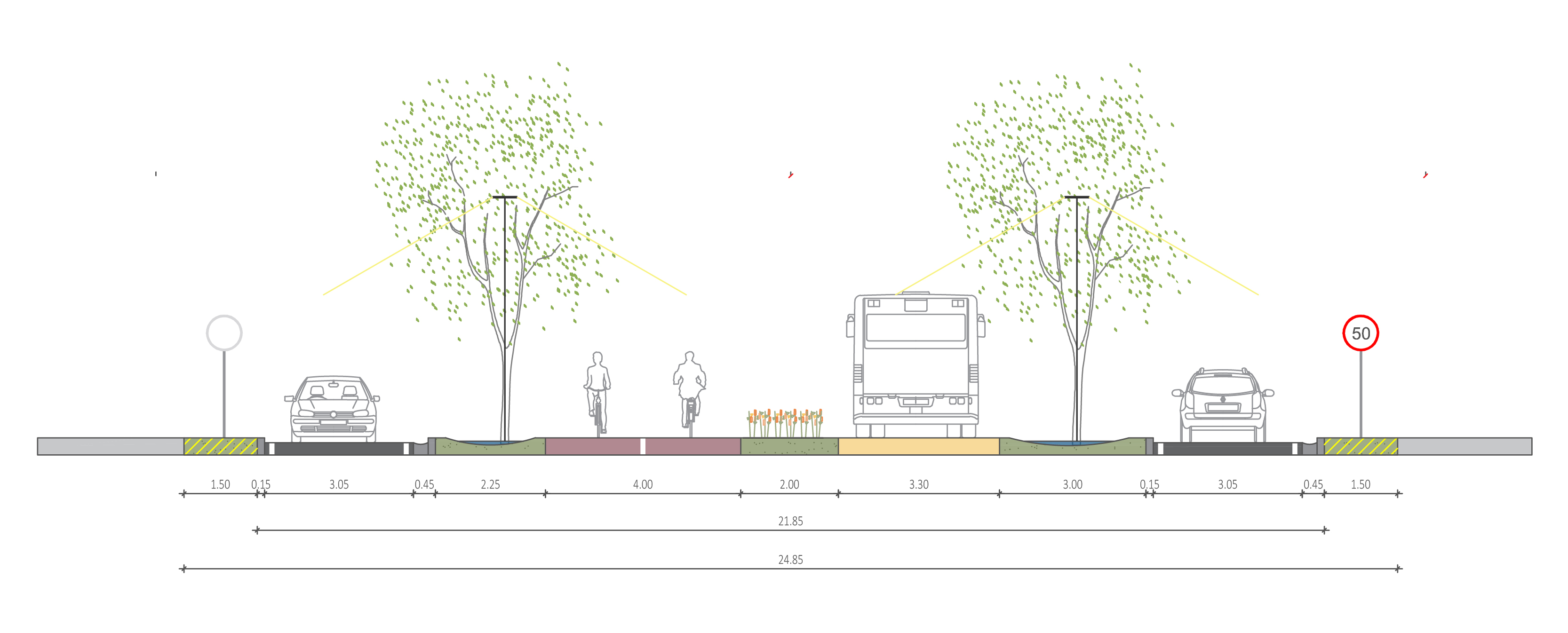Het gemotoriseerd verkeer krijgt links en rechts van deze centrale strook een rijbaan en op drie plaatsen komt er een keerlus. Om het verkeer op de keerlussen te laten kruisen met de bussen en fietsers op de centrale strook zijn er verkeerslichten voorzien.