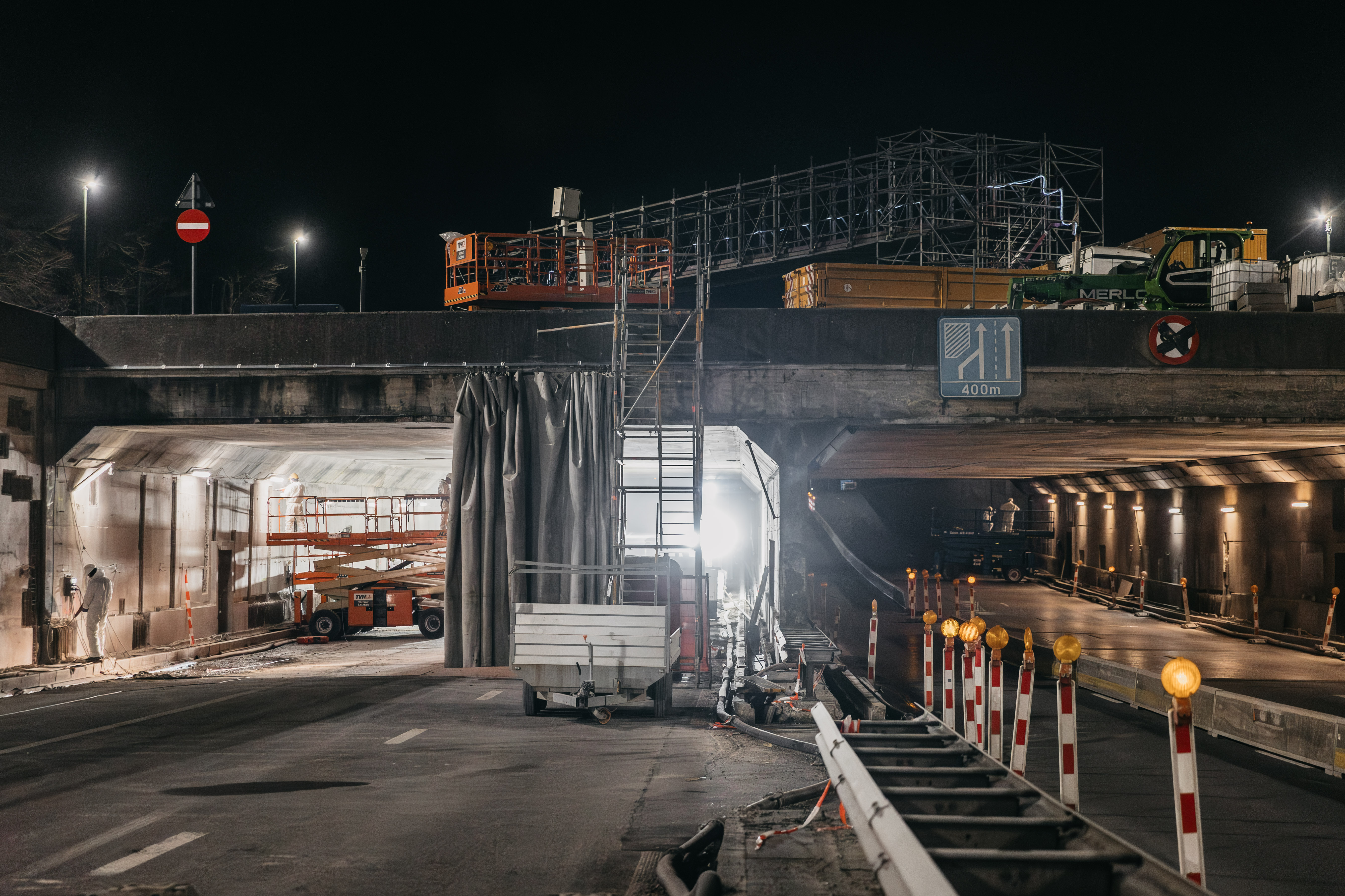 De komende maanden voeren we nog noodzakelijke ingrepen uit om de tunnel van de R0 en van de E411 volledig af te werken. We plaatsen onder andere brandwerende panelen, blusleidingen en bijkomende technische installaties. Die werken voeren we voornamelijk ’s avonds en ’s nachts uit. In december 2025 werken we ‘s nachts aan de tunnel van de E411. In de loop van 2026 werken we ‘s nachts aan de tunnel van de R0.