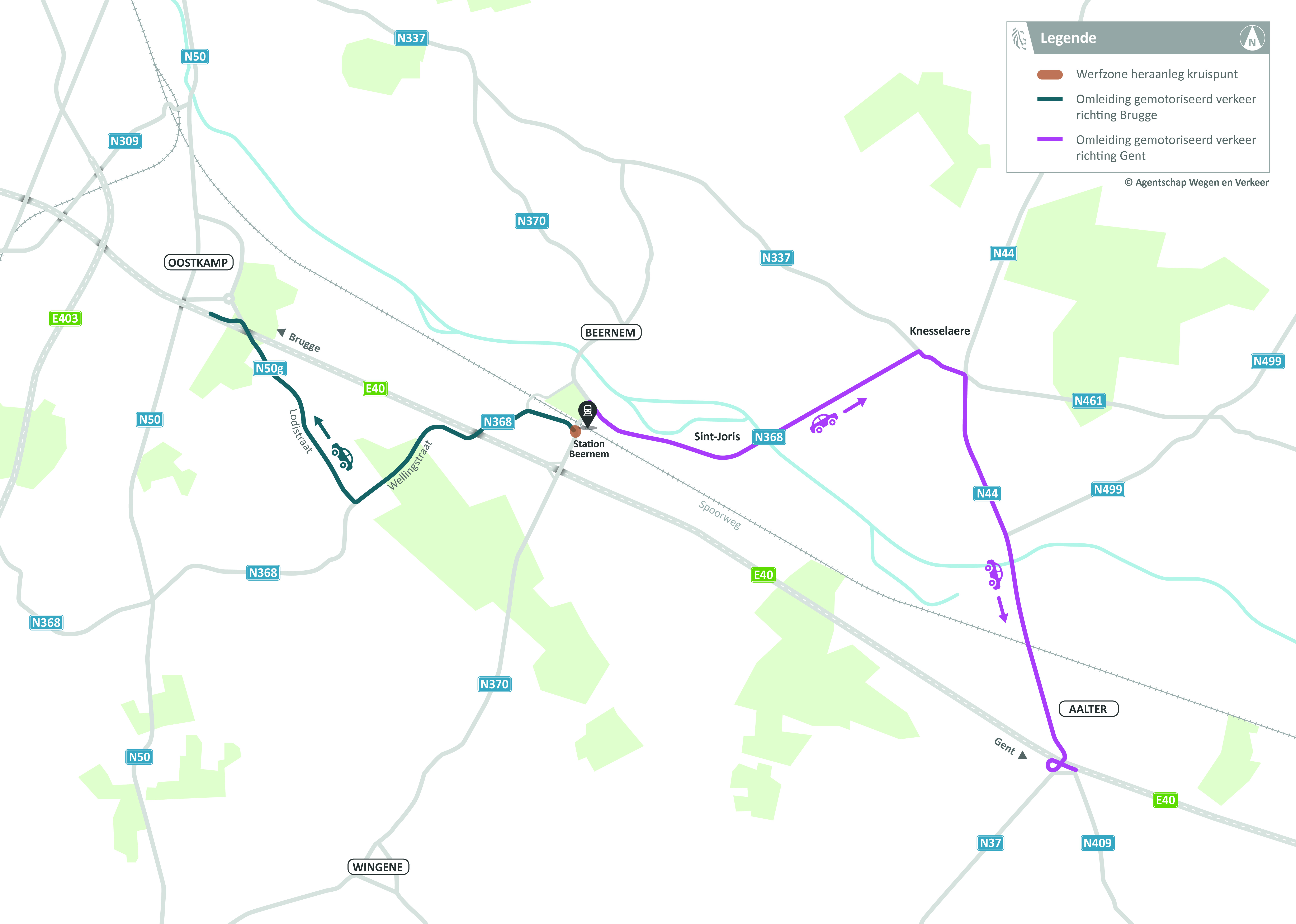 - Gemotoriseerd verkeer van de E40 naar Beernem volgt een omleiding via het zuidelijke deel van het kruispunt van de Hubert d’Ydewallestraat met de Wingene Steenweg naar de Hubert d’Ydewallestraat en de Wellingstraat.